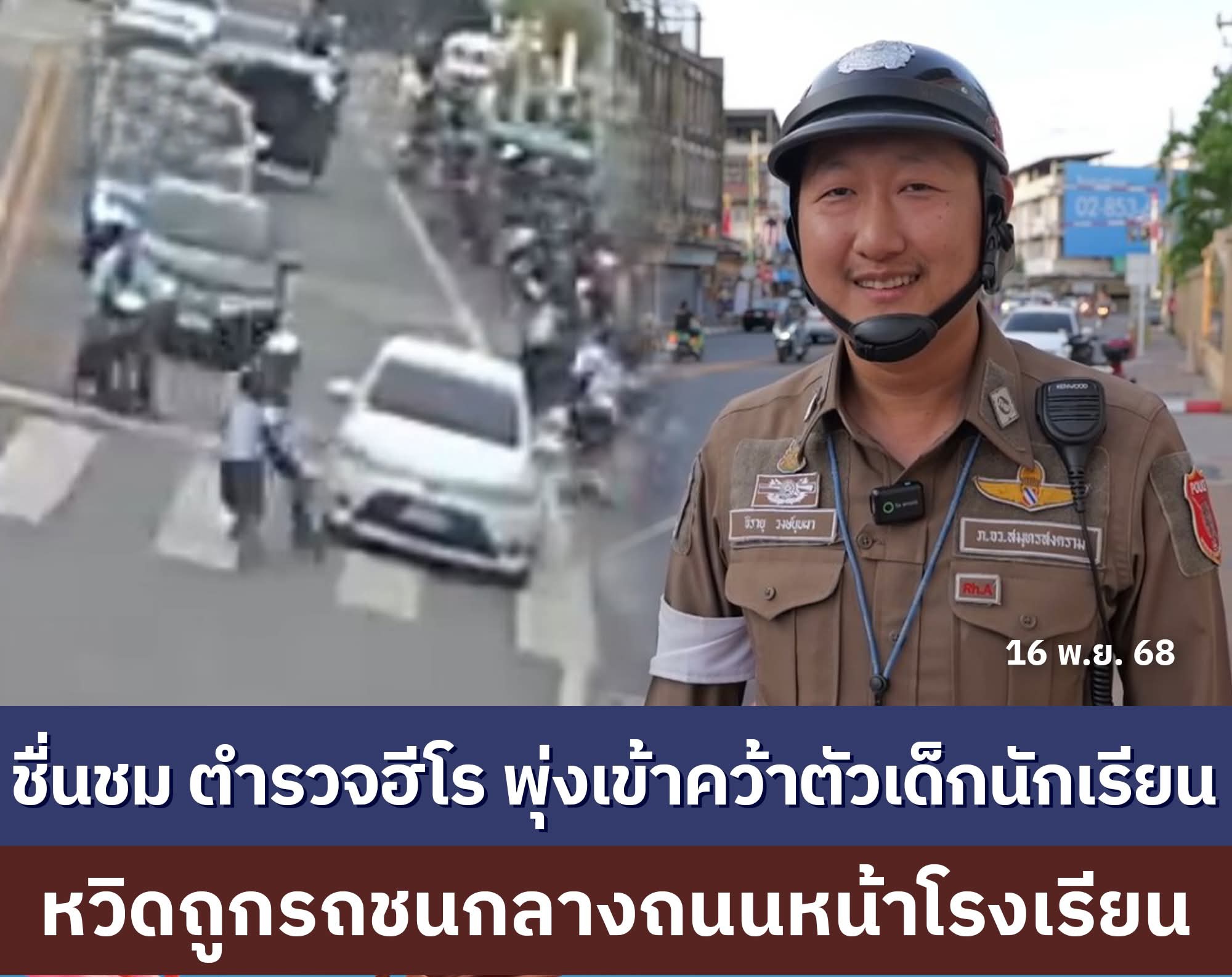 ชื่นชม ตำรวจฮีโร พุ่งเข้าคว้าตัวเด็กนักเรียน หวิดถูกรถชนกลางถนนหน้าโรงเรียน